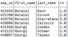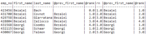 from employees e, (SELECT @rank:=0) x1, (SELECT @prev_first_name:=NULL) x2