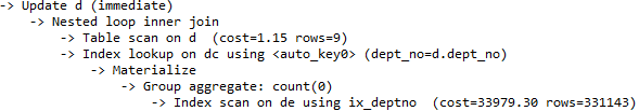 update (select de.dept_no, count(*) as emp_count from dept_emp de group by de.dept_no) dc