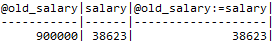 위 쿼리를 보면 @old_salary 변수에 salary 값으로 '"38263"이 저장 됐음을 알 수 있다.