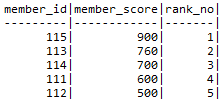 member_score로 랭킹을 저장하는 테이블이다. 각 회원의 member_score는 매번 게임에 참여할 때 마다 업데이트 하지만 rank_no는 몇 시간 단위로 집계 한다고 할 때 member_score를 역순으로 읽어 rank_no 컬럼을 업데이트 할수도 있지만 사용자 정의 변수를 이용해 업데이트 할 수 있다.