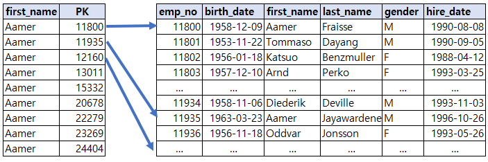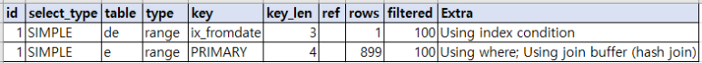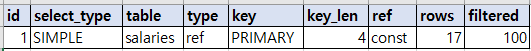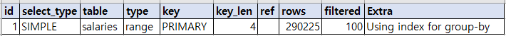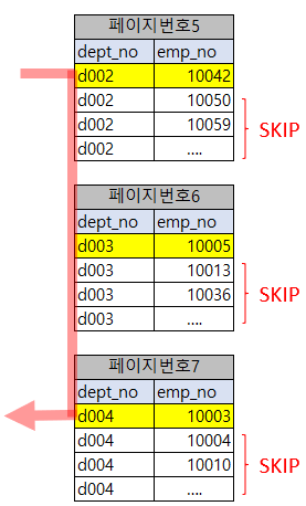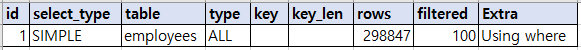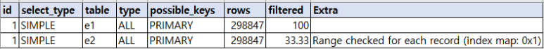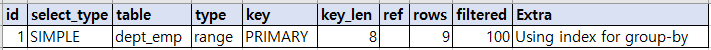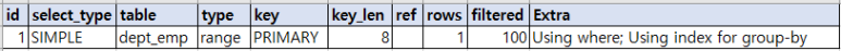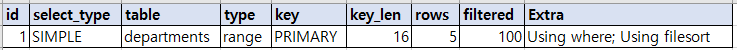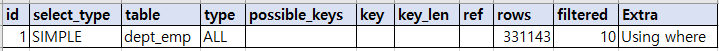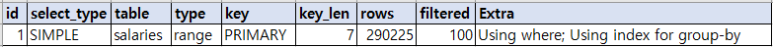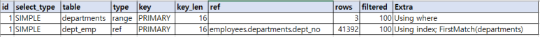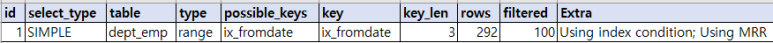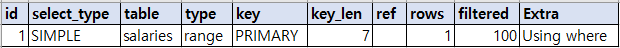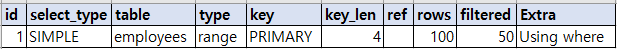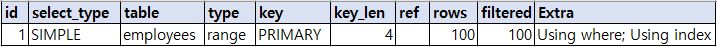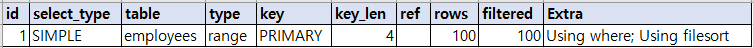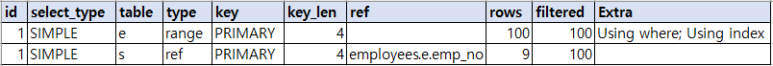 where emp_no between 100001 and 100100 -- Index range scan(PK)