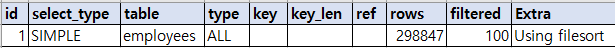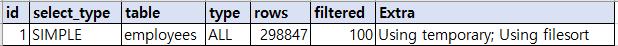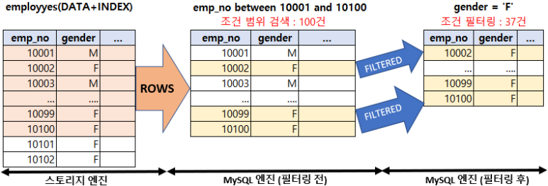 인덱스를 통해 검색된 결과 레코드를 별도의 정렬 처리 과정(Filesort)을 거쳐서 정렬을 수행한다. WHERE 절의 조건에 일치하는 레코드의 건수가 많지 않을 때 효율적이다.