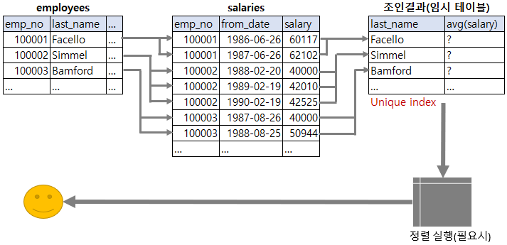 이 순서가 바뀌어서 실행되는 형태의 쿼리는 거의 없다. ORDER BY나 GROUP BY 절이 있다 하더라도 인덱스를 이용해 처리할 때는 그 단계 자체가 불필요하므로 생략된다.