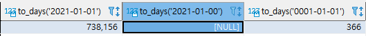 TO_DAYS 함수는 입력된 날짜 값의 포맷이 잘못돼 있다면 NULL을 반환할 수도 있다. 이렇게 MySQL의 파티션 키가 TO_DAYS()와 같이 NULL을 반환할 수 있는 함수를 사용할 때는 쿼리의 실행 계획에서 partitions 컬럼의 테이블의 첫 번째 파티션에 포함되기도 한다. range 파티션을 사용하는 테이블에서 NULL은 항상 첫 번째 파티션에 저장되기 때문에 실행 계획의 partitions 컬럼에 첫 번째 파티션도 함께 포함된다. 하지만 실제 필요한 파티션과 테이블의 첫 번째 파티션이 함께 partitions 컬럼에 표시된다 하더라도 성능 이슈는 없다.