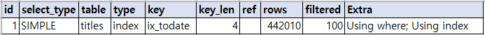 explain select * from titles where ISNULL(to_date) = true; -- index full scan